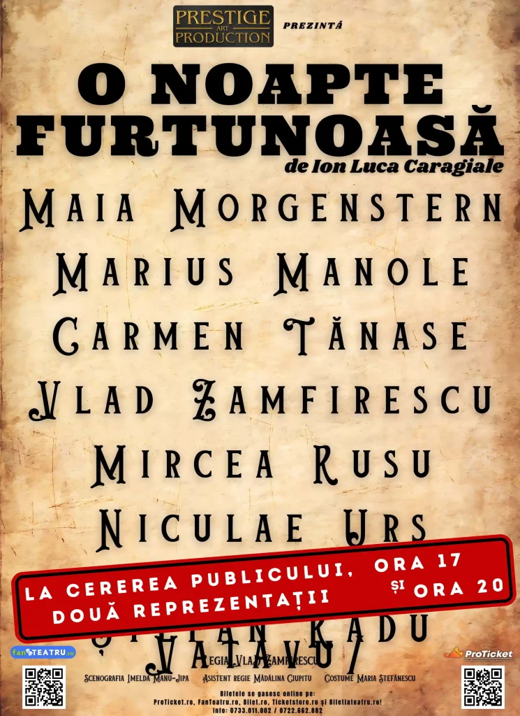 Un spectacol alert și surprinzător, de un comic exploziv, care te pune pe gânduri, cu o distribuție excepțională – este „O noapte furtunoasă” despre valori naționale și personale, despre haz de necaz, despre patrioți și familiști, ciocoi și ziariști care combat, dar mai ales despre iubire, în formele ei mai mult sau mai puțin… tradiționale.