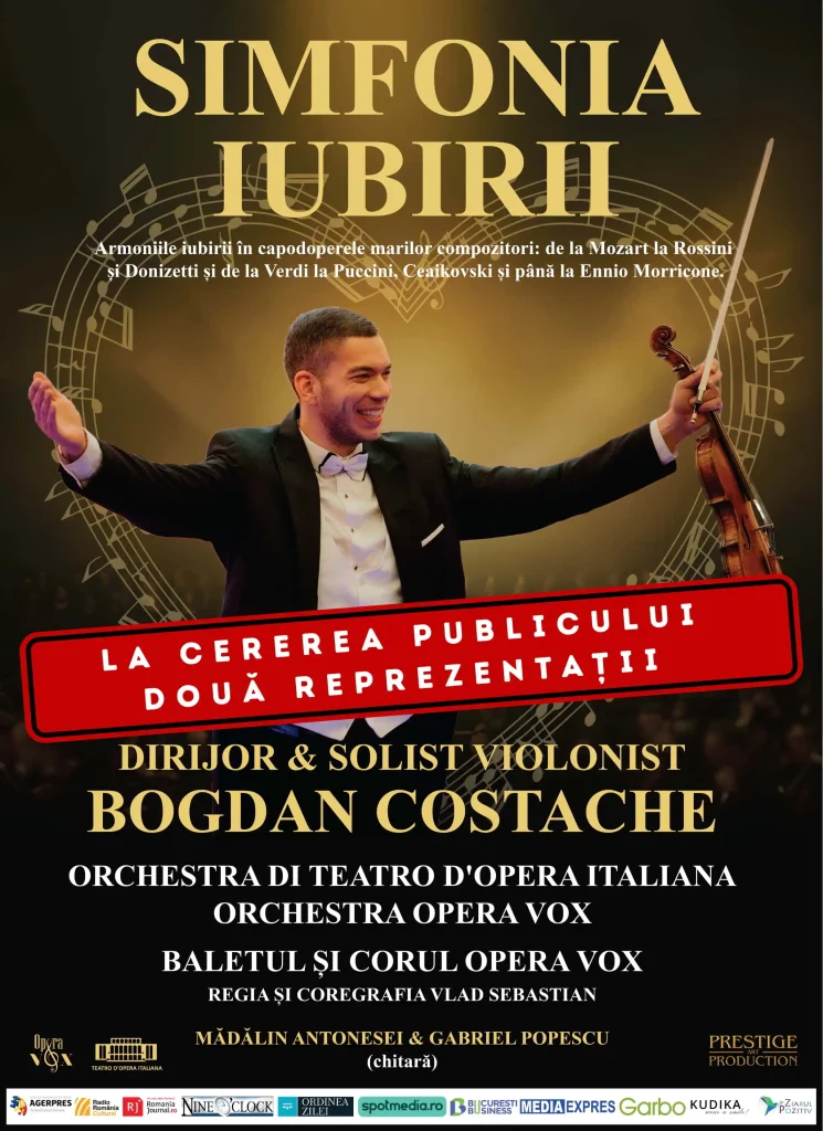 Vă invităm la un spectacol grandios în care Orchestra di Teatro d’Opera Italiana, Orchestra Opera Vox, Baletul și Corul Opera Vox, alături de dirijorul și solistul violonist Bogdan Costache, se împletesc într-o experiență artistică unică.