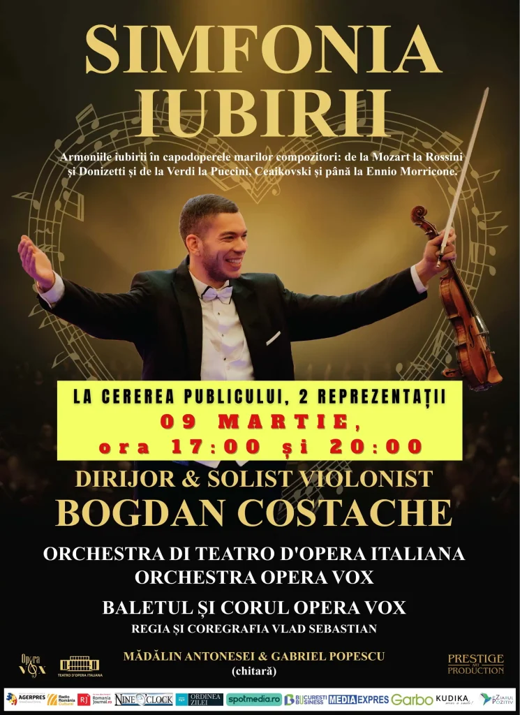 Vă invităm la un spectacol grandios în care Orchestra di Teatro d’Opera Italiana, Orchestra Opera Vox, Baletul și Corul Opera Vox, alături de dirijorul și solistul violonist Bogdan Costache, se împletesc într-o experiență artistică unică.